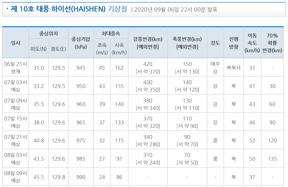 중심 기압은 925hPa로 중심 부근의 최대 풍속은 50m/s, 최대 순강 풍속은 70m/s로 발표하였습니다. 9월 6일 7시 기상청 예보에 따르면, 대형으로 매우 강한 태풍인 10호 태풍 하이선은 세력이 다소 약화되어고, 가고시마현에서는 특별 경보를 발표할 가능성이 작아졌지만, 7일까지 북상하며 매우 강한 세력으로 규슈 남부 아마미 지방에 상당히 접근하였으며, 계속해서 호우, 폭풍, 해일에 대한 최대의 경계가 필요하다고 발표하였습니다.