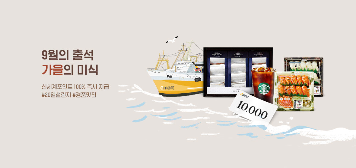 출석 체크하시고, 신세계 포인트 1포인트 적립하시고, 누적 출석 5일마다 추가 경품에 자동 응모됩니다. 총 20일 참여하시면 20일 챌린지에 성공하시게 됩니다. 행사 상품은 아래와 같이 황제 갈치, 초밥 교환권, 이마트 상품권 만원, 스타벅스 아이스 아메리카노 Tall을 추첨을 통하여 지급됩니다. 많이 많이 참여하세요.
