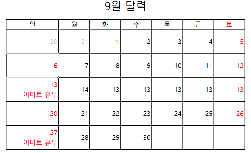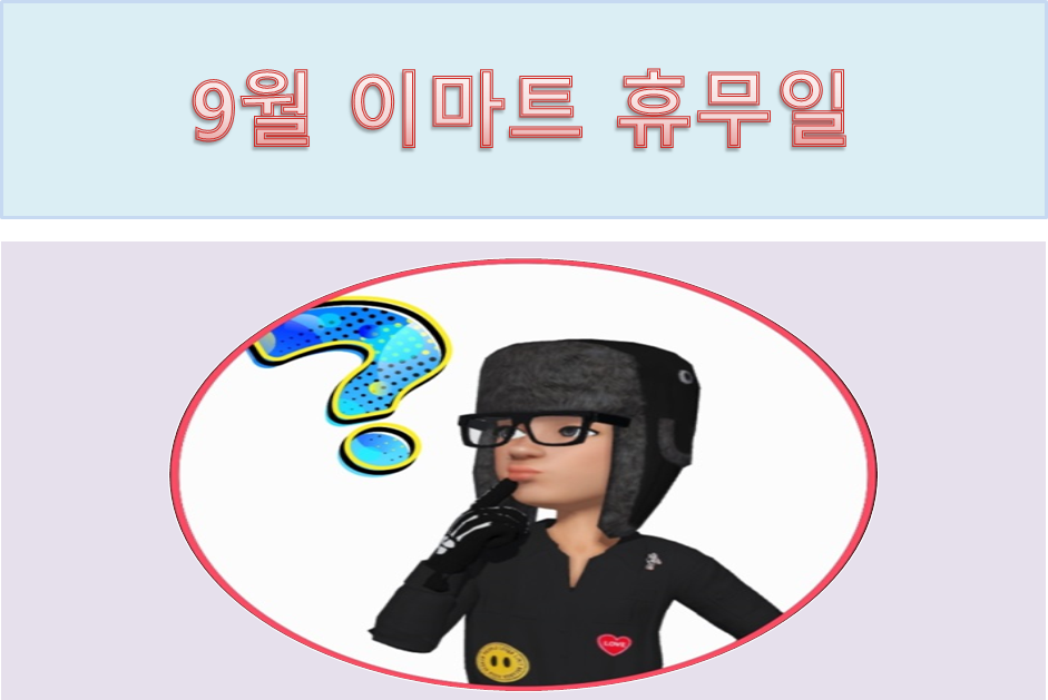 9월 이마트 휴무일은 13일과 27일입니다. 월 4주 중 2주는 휴무일이기 때문에 날짜 조절 잘하셔서 미리미리 구매하시기 바랍니다. 트레이더스 휴무일도 포함됩니다.