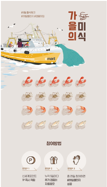 출석 체크하시고, 신세계 포인트 1포인트 적립하시고, 누적 출석 5일마다 추가 경품에 자동 응모됩니다. 총 20일 참여하시면 20일 챌린지에 성공하시게 됩니다. 행사 상품은 아래와 같이 황제 갈치, 초밥 교환권, 이마트 상품권 만원, 스타벅스 아이스 아메리카노 Tall을 추첨을 통하여 지급됩니다. 많이 많이 참여하세요.
