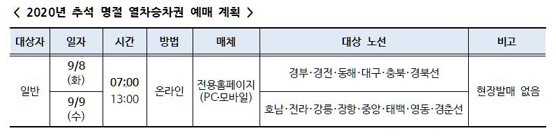<2020년 추석 명절 열차 승차권 예매 계획>