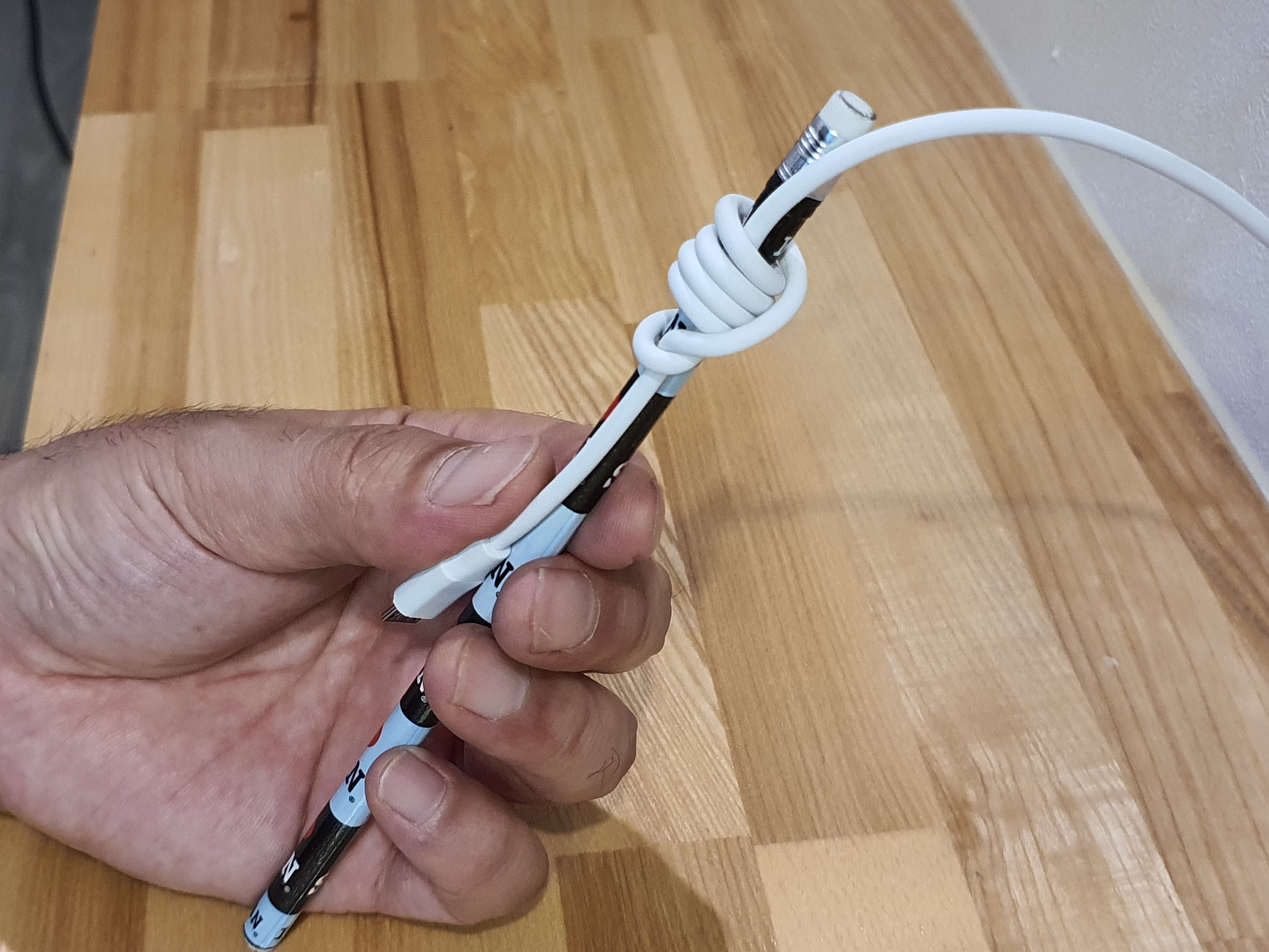 아래 두꺼운줄로 연필에 묶는 사진을 참고 올렸으니, 보시고 한번 도전 해보세요.