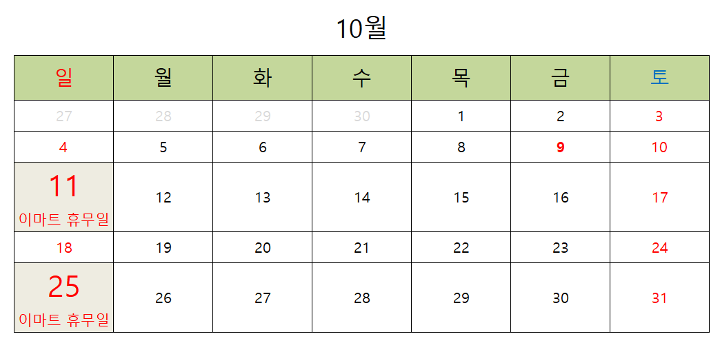 그러면 10월 이마트 휴무일에 대해서 알아보도록 하겠습니다.
